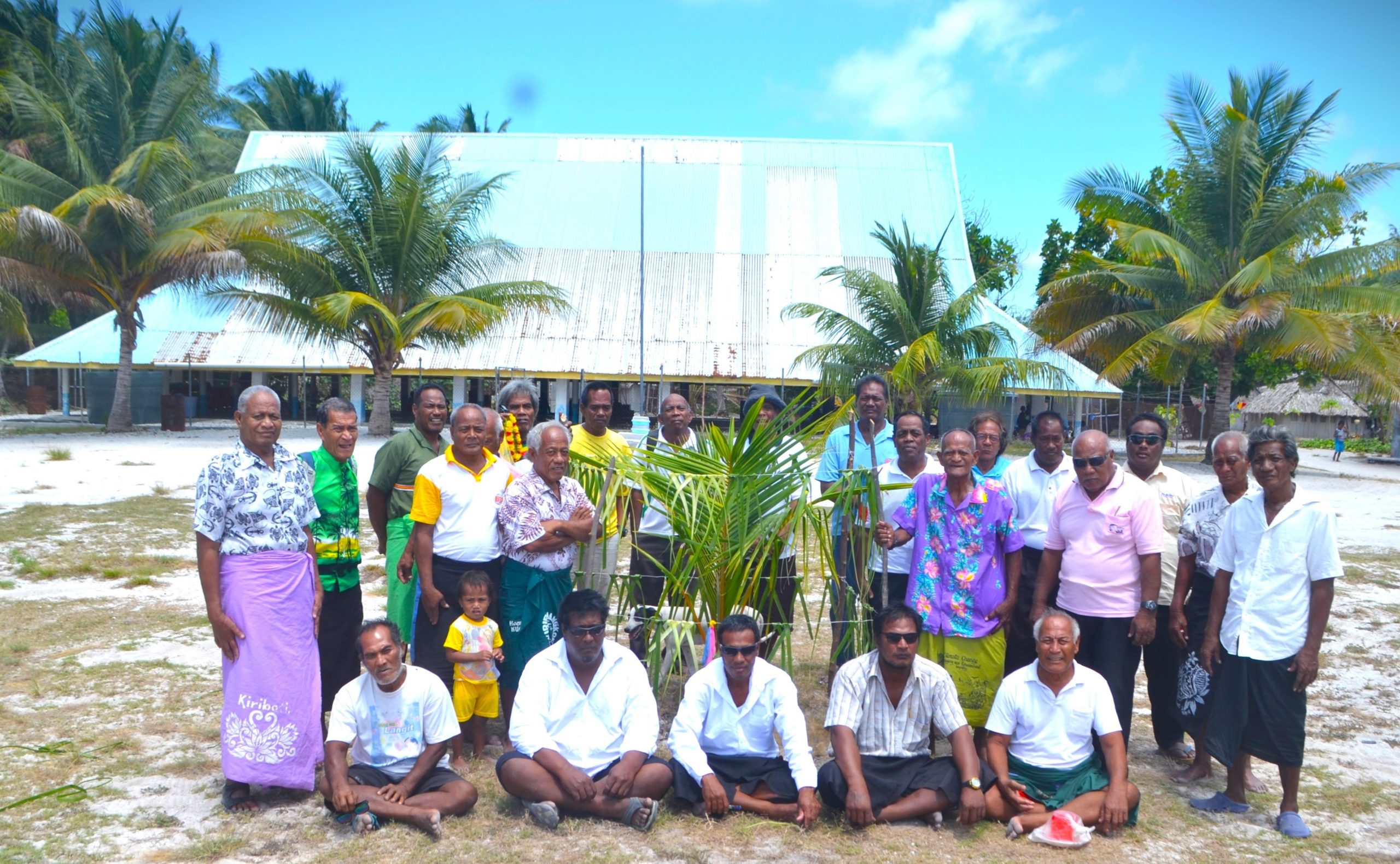 Traditional leaders and councilors on Aranuka Island with their growing coconut tree planted to symbolize their intentions and aspirations that Aranuka will grow, prosper and bear good fruits.